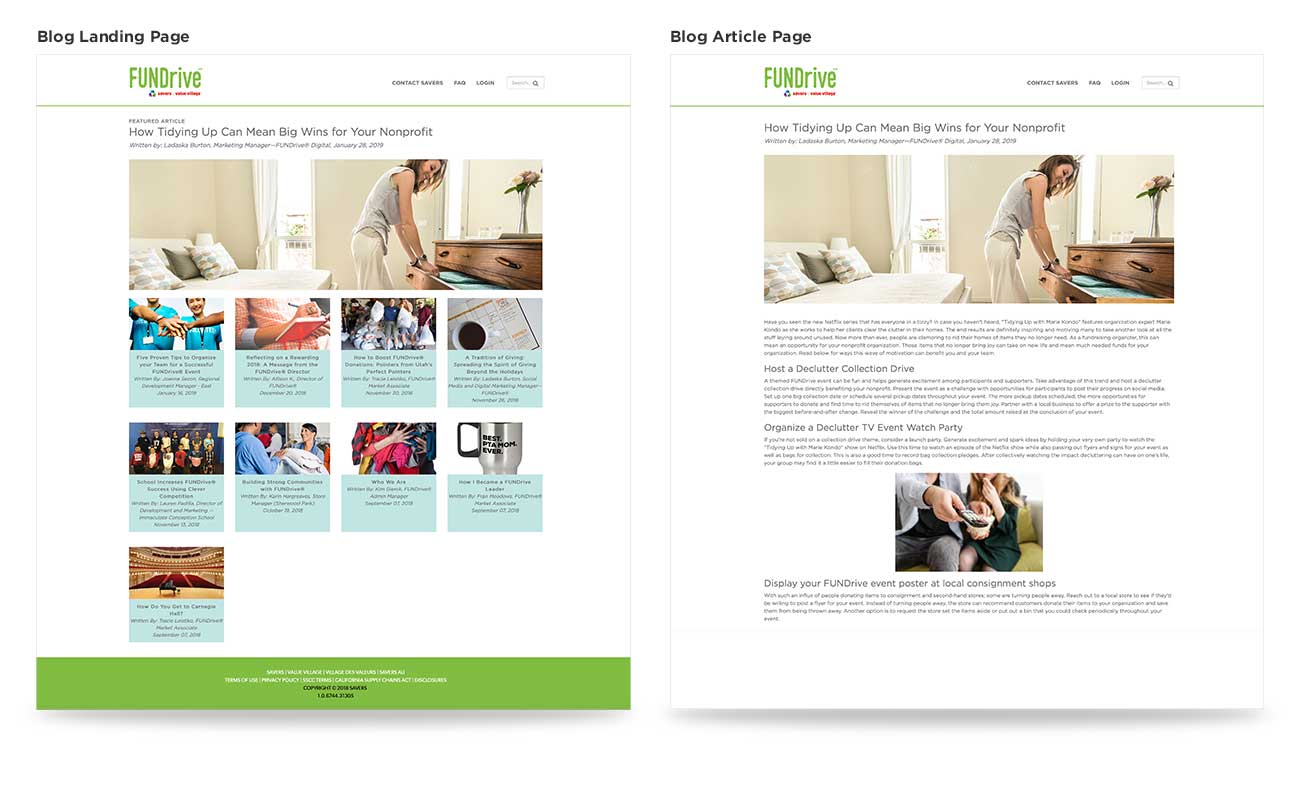 I added blog page to host articles about everything for organization ideas to fundraising tips to successful event stories. All these pages carried the same brand and style guide for consistency.
