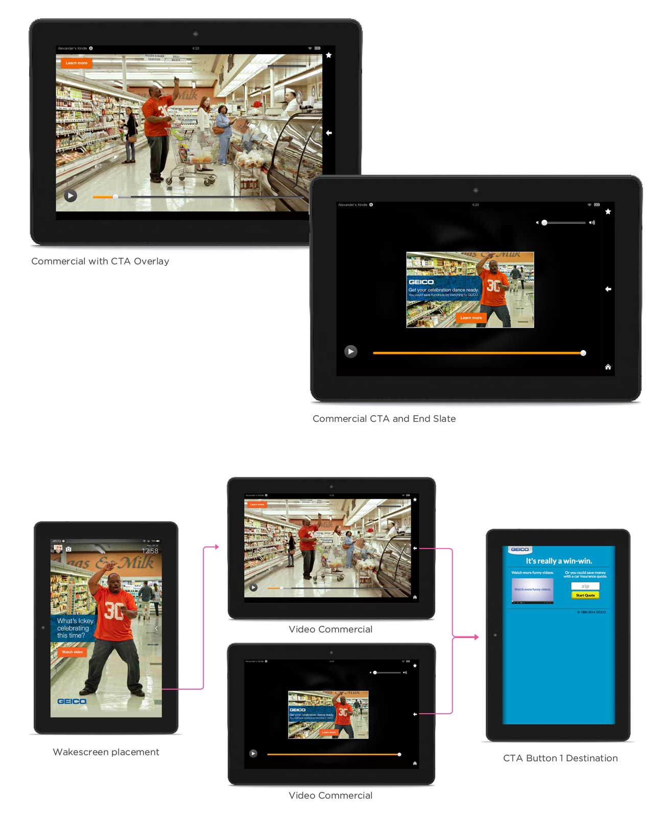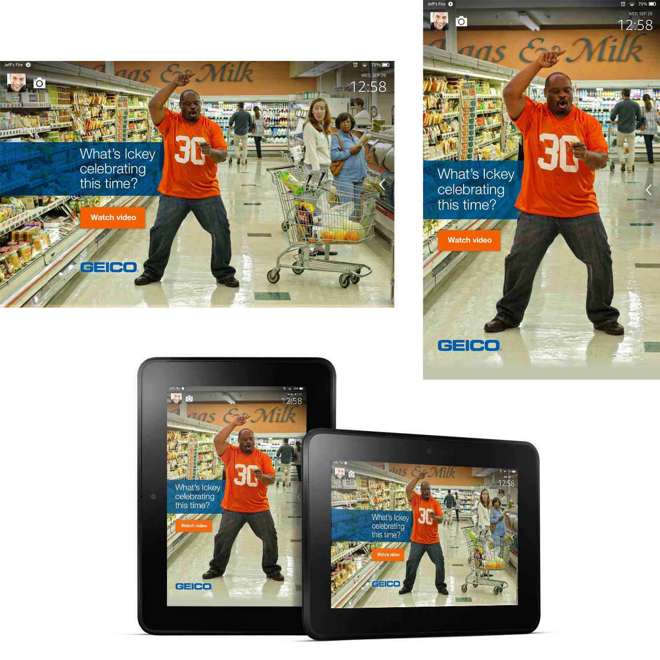 This ad ran on Amazon's Kindle Fire and was designed to promote and direct customers to view GEICO's new commercial featuring Ickey Woods in addition to promoting special offers.