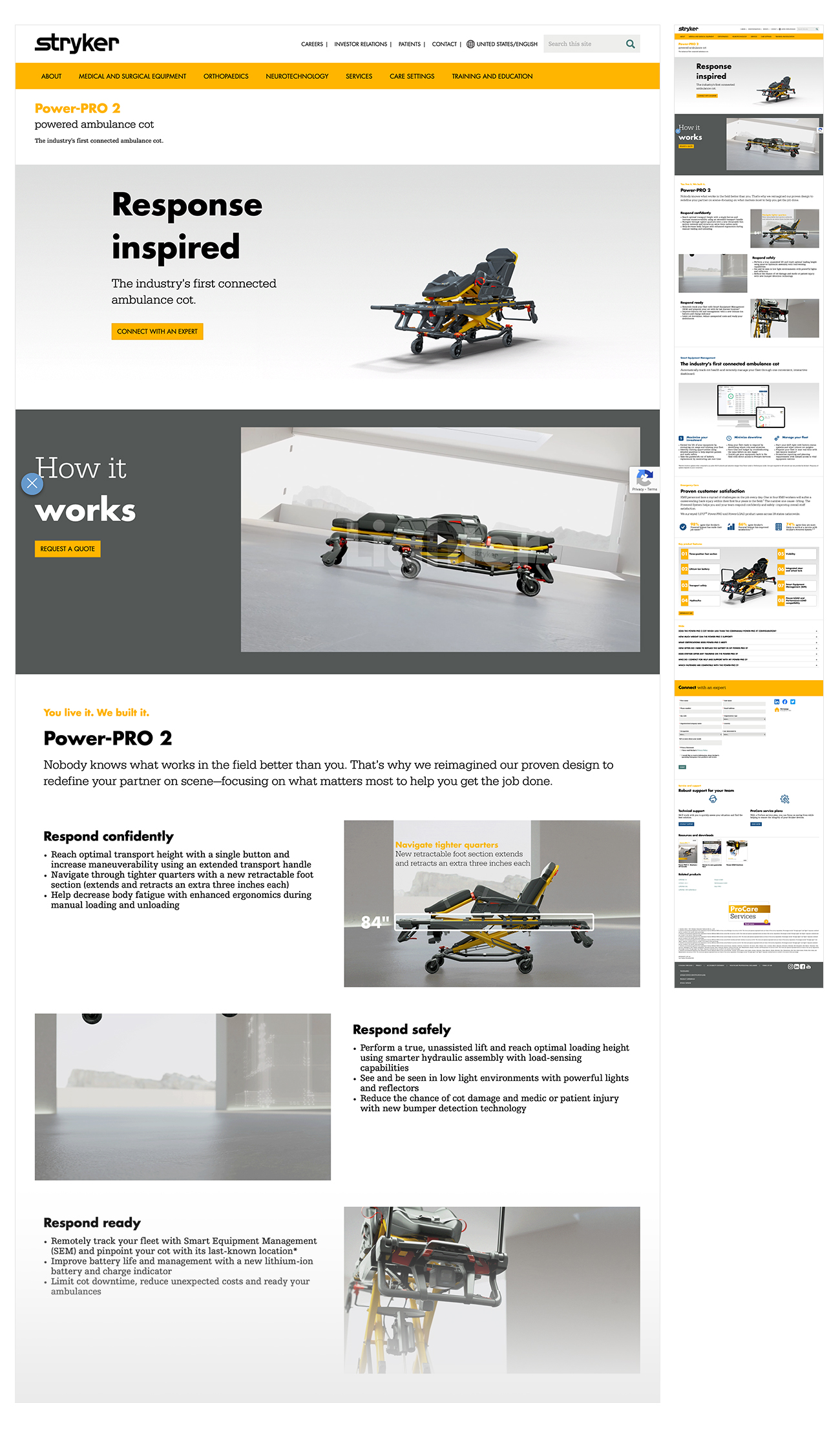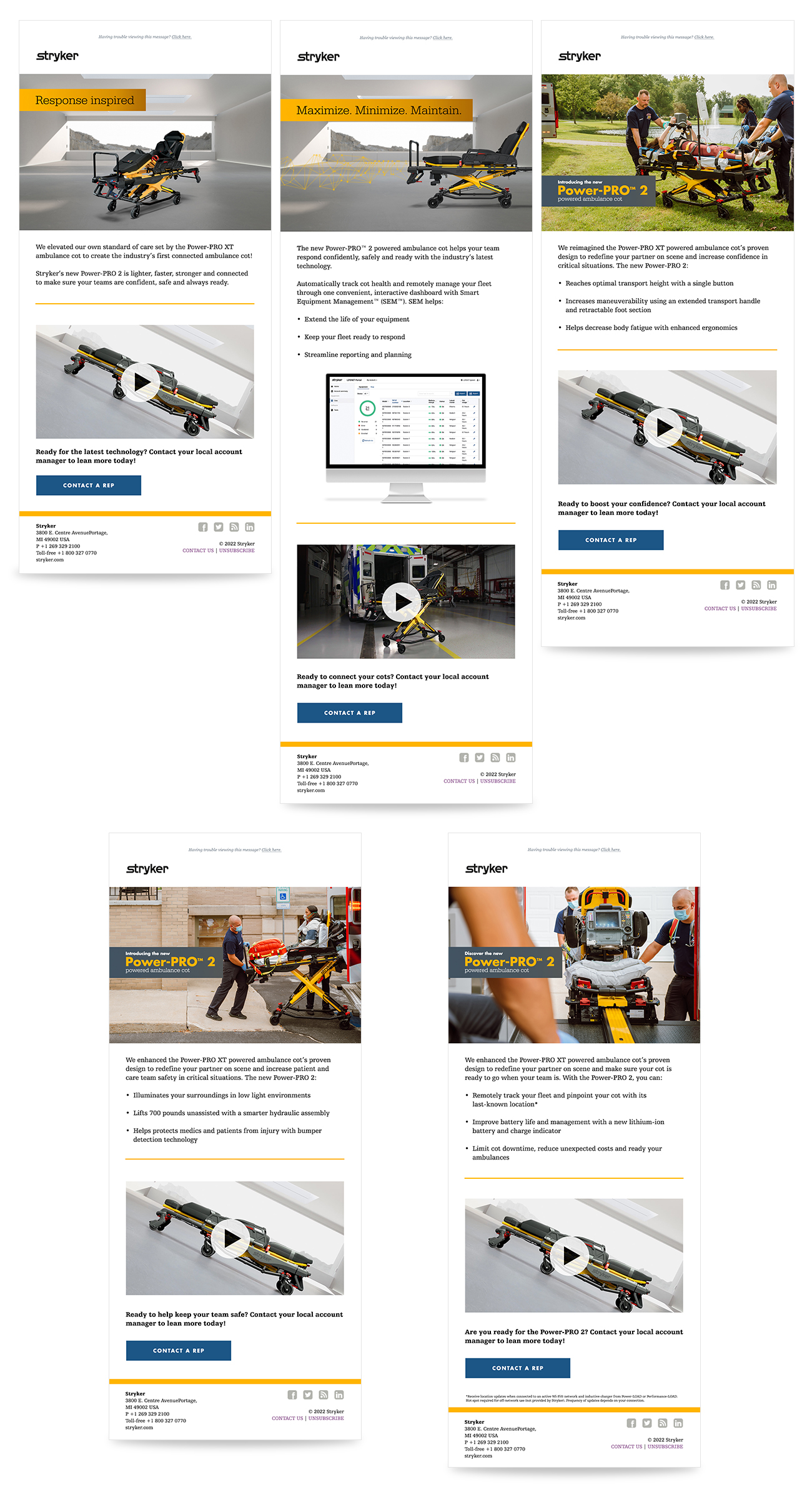 In 2022, Stryker launched the Power-PRO 2 powered ambulance cot to the world. This next generation cot is one of Stryker's most recognizable products. I was proud to be the lead designer and creative director that put this together. For this launch, we re-tooled our messaging and built out collateral utilizing the lenses of the our Customer Messaging Framework. Our suite of deliverables championed the commitment of our audience (paramedics, EMTs) while authentically upholding the values and intention of Stryker's global brand.