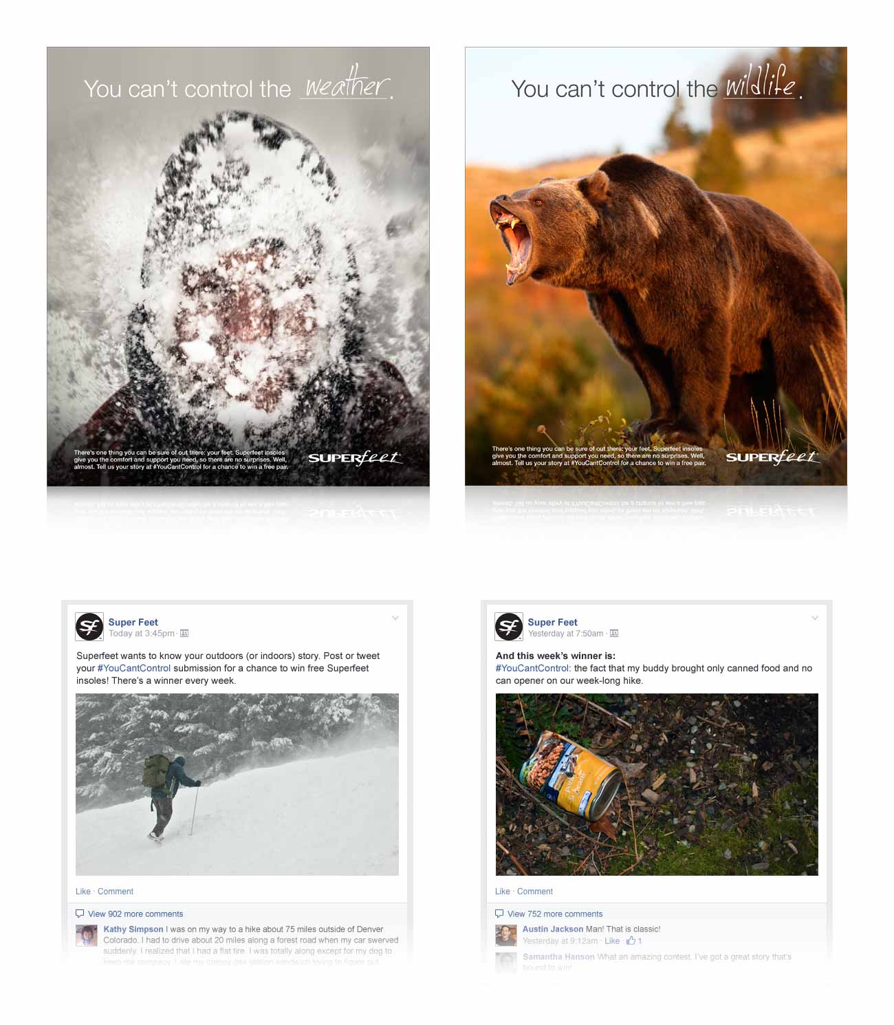In this integrated campaign, we posed the question of what people couldn’t control when they were outdoors, and in doing so, created a host of fans and followers dying to tell their stories—all for the chance to win a weekly pair of Superfeet.